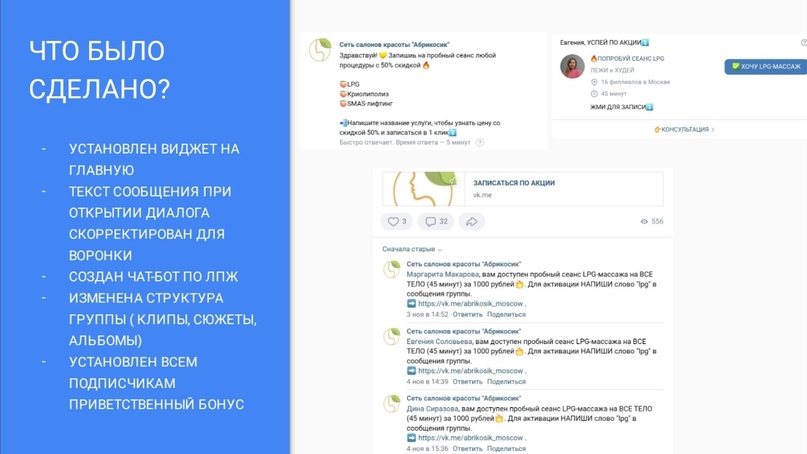Группу я получила заброшенную с 10 подпичиками. Но связка была уже проверна на другой бургерной, поэтому я действовала по отработанной схеме.